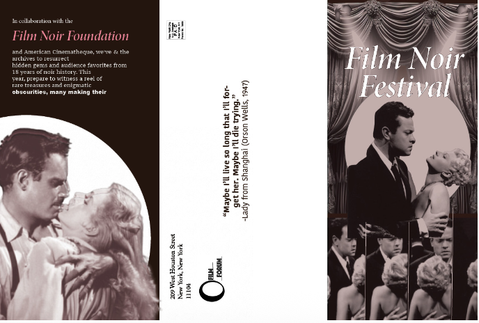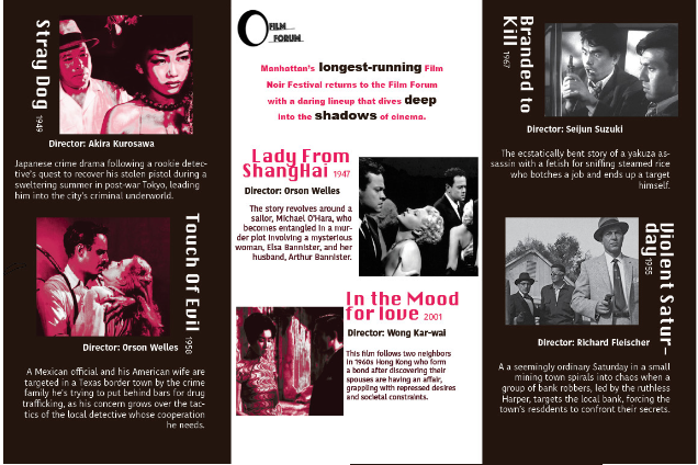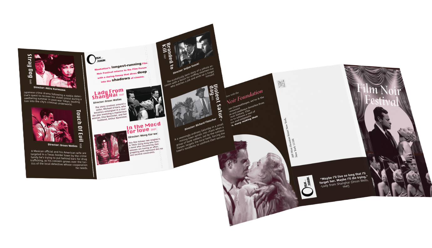Created to reintroduce Film Noir to a broader, more diverse audience, this project reimagines the visual identity of the Film Forum with a bold, contemporary edge. Through a refreshed logo and a striking tri-fold invitation, the design blends the timeless sophistication of classic noir with modern aesthetics.