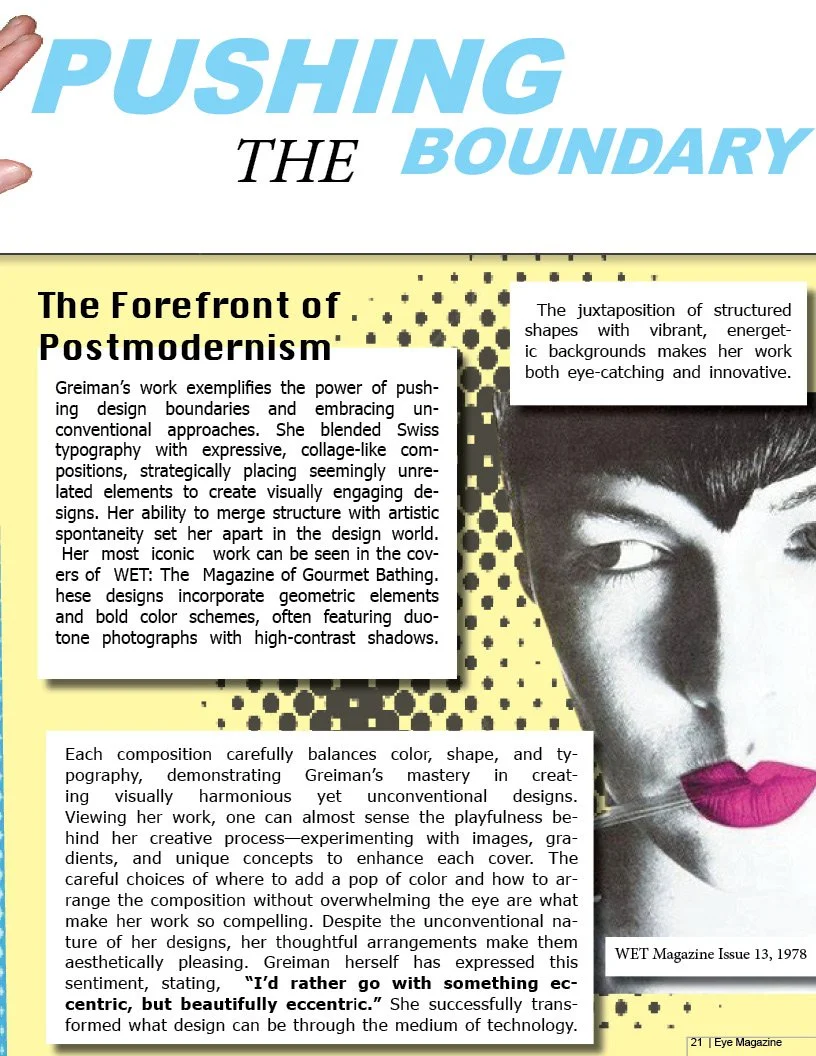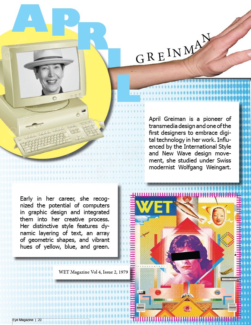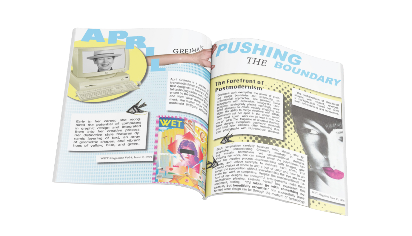 For this editorial magazine spread, I wrote and designed a feature on graphic designer April Greiman, whose vibrant, nostalgic aesthetic inspired the overall visual direction. Drawing from her retro-influenced style, I incorporated bold typography, vintage color palettes, and playful graphic elements to reflect her distinctive artistic voice.